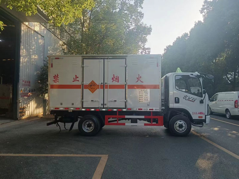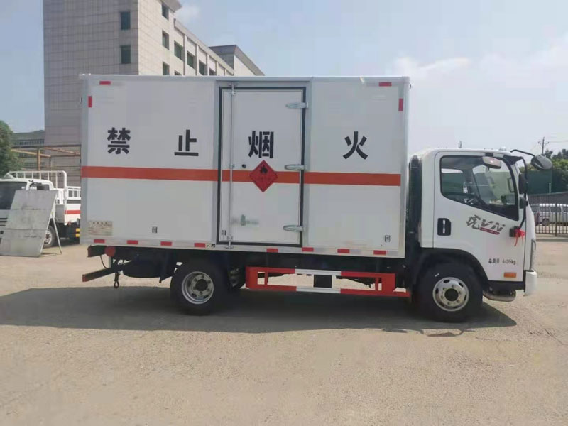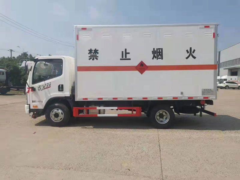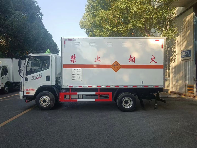 箱體雙層金屬骨架制成,外部為冷軋鋼板,內壁采用鋁合金板蒙面,夾層為隔熱阻燃材料,側壁設有防雨自然通風口,滅火器,防火罩,危險警示三角燈,危險標識,警告標識,國標反光板,1類爆破器材標示牌,其余標配。