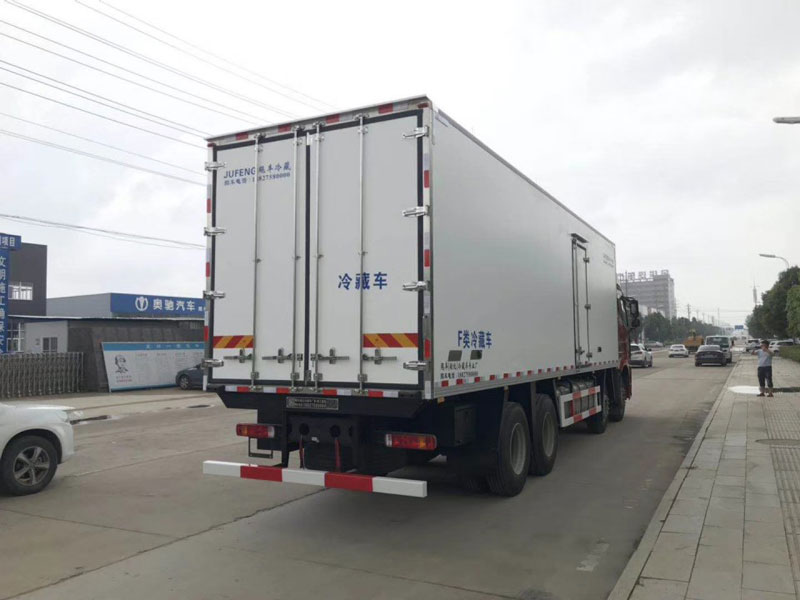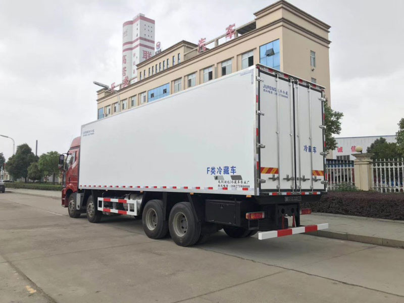 解放J6P前四后八程力9米6冷藏車功能的選擇:底部可選擇鋁花紋板或者玻璃鋼,頂部滑倒肉溝、通風(fēng)曹、通風(fēng)窗、溫濕度記錄儀、增氧機(jī)、220V備用電等功能。
